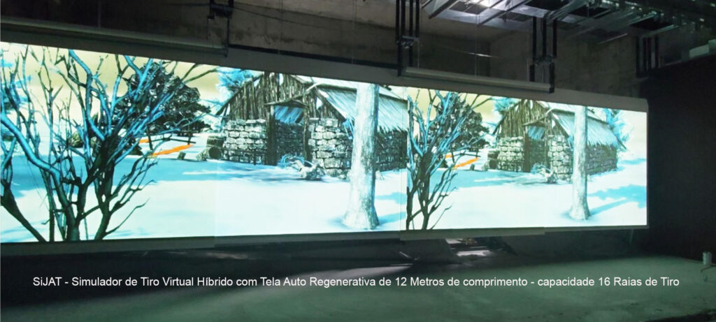 O Simulador Híbrido SiJAT-H é o único sistema que permite disparos de munição real diretamente na tela do simulador. Com uma tela de alta regeneração e capacidade de disparo de 5.000 tiros por m², oferece durabilidade incomparável para treinamento intensivo.